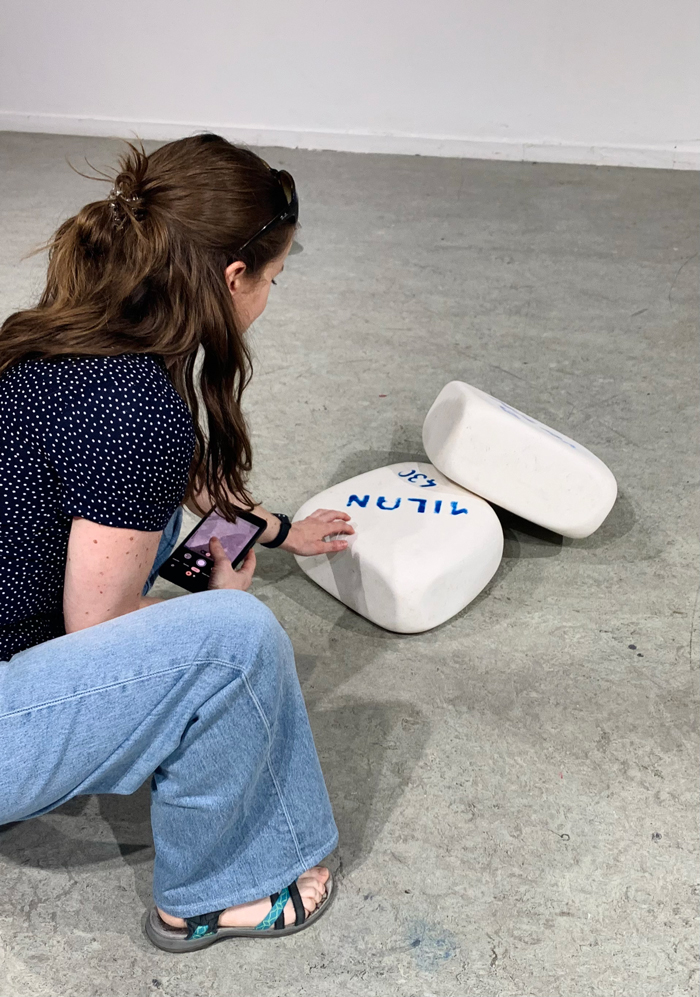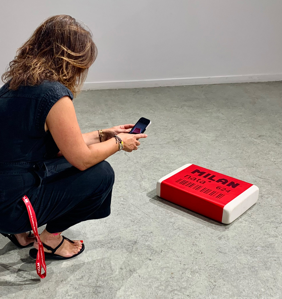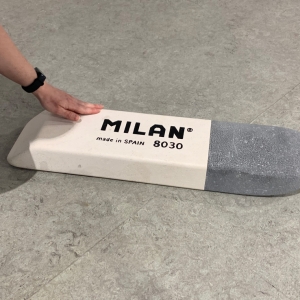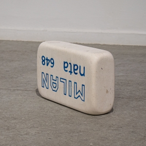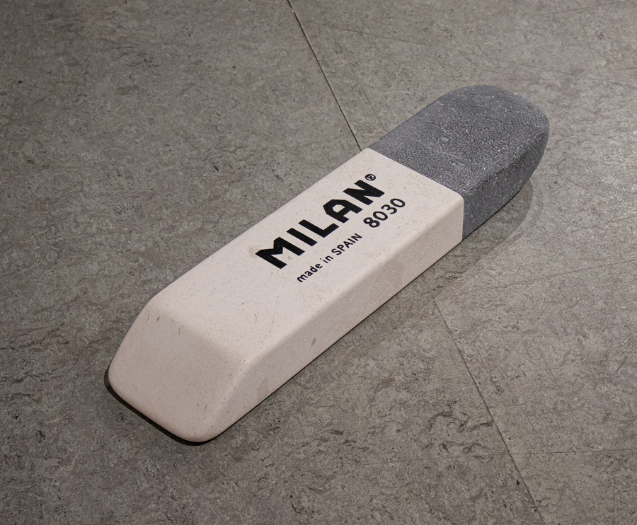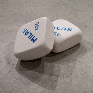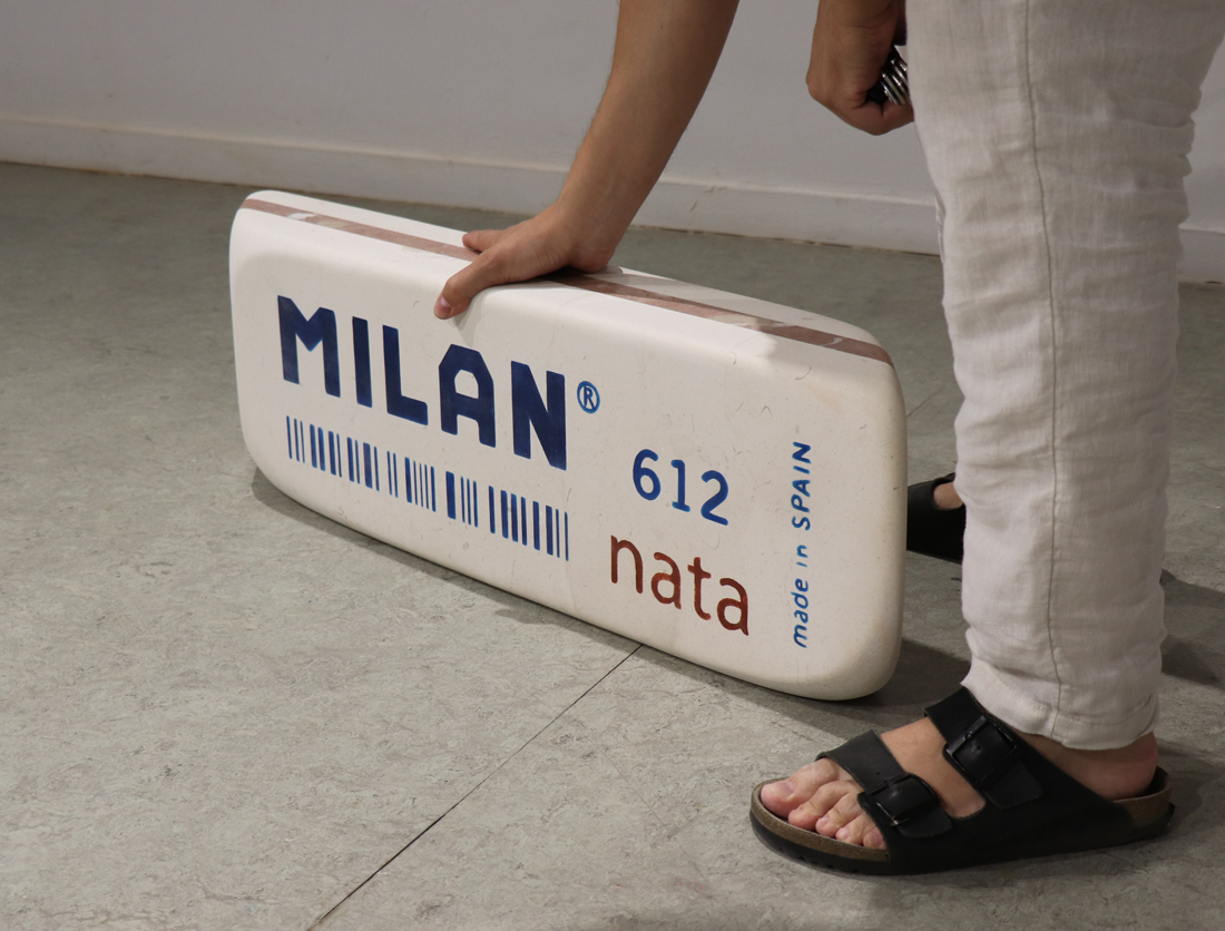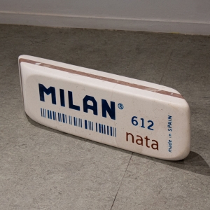 En «objetos comunes» Antonio Jurado reflexiona sobre nuestra sociedad y el consumo excesivo, la producción en masa, la acumulación, la atracción y el deseo que todo ello genera. Los objetos que Jurado nos presenta son comunes porque no hay nada que les haga especiales en principio, forman parte de nuestra vida cotidiana. Sin embargo, en su proceso artístico juega con la escala convirtiendo esos objetos en objetos descomunales, algo que no solo implica el cambio de dimensión evidente, sino que lo des-comunal aquí también se refiere a salirse de lo común, hacerse algo extraordinario. Entre la alteración de la escala y la ausencia del color -o en la homogeneidad del color del mármol-, el trabajo de Jurado logra, por una parte, que quien lo mira reconozca la figura, y por otro una sensación de extrañeza, de estar entre lo familiar y lo desconcertante, incluso hasta sentirnos encogidos-as ante su obra -encogidos y sobrecogidos.